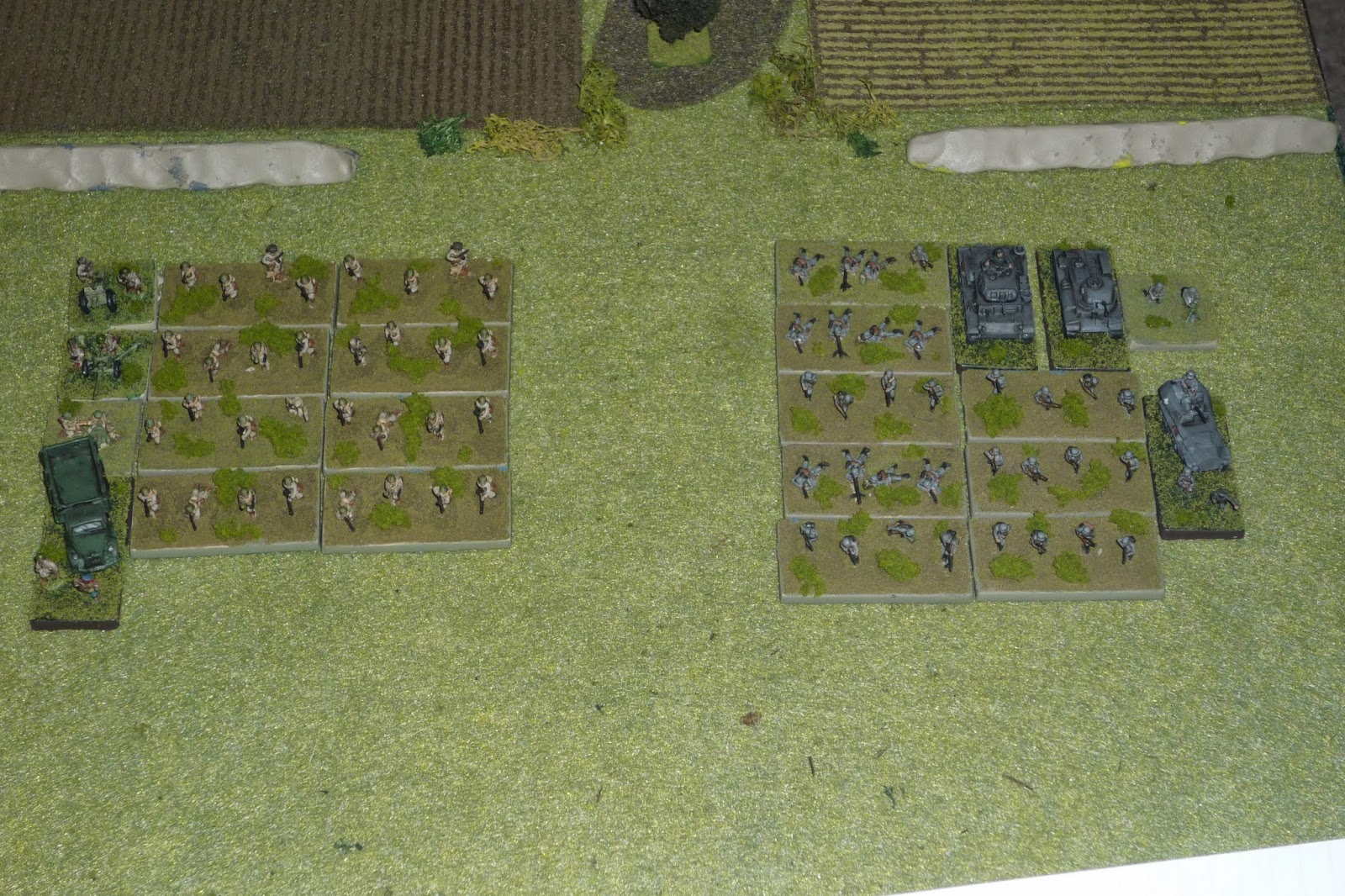 The Germans, with a star studded roster of no less than four holders of the Iron Cross 2nd Class: led by the Schutzen Company Comander, 1st Lt Freitag (Iron Cross), all of his 3rd Grenadier Platoon (led by 2nd Lt Tausch, Sgt Schlessinger's 1st Squad, Cpl Nader's 2nd Squad, Cpl Hauer - Iron Cross - 3rd Squad, and Cpl Kamphaus' 4th Squad), three squads from 4th Grenadier Platoon (acting platoon commander Sgt Mader - Iron Cross - with the HQ section, Cpl Kandler's 1st Squad, and Cpl Imhofe -Iron Cross - 3rd Squad), supported by two tanks of 2nd Panzer Platoon (acting Platoon Commander Sgt Grossman's Pz Mk III and LCpl Otjen's Pz Mk II) and Cpl Osswald's 80mm mortar.
