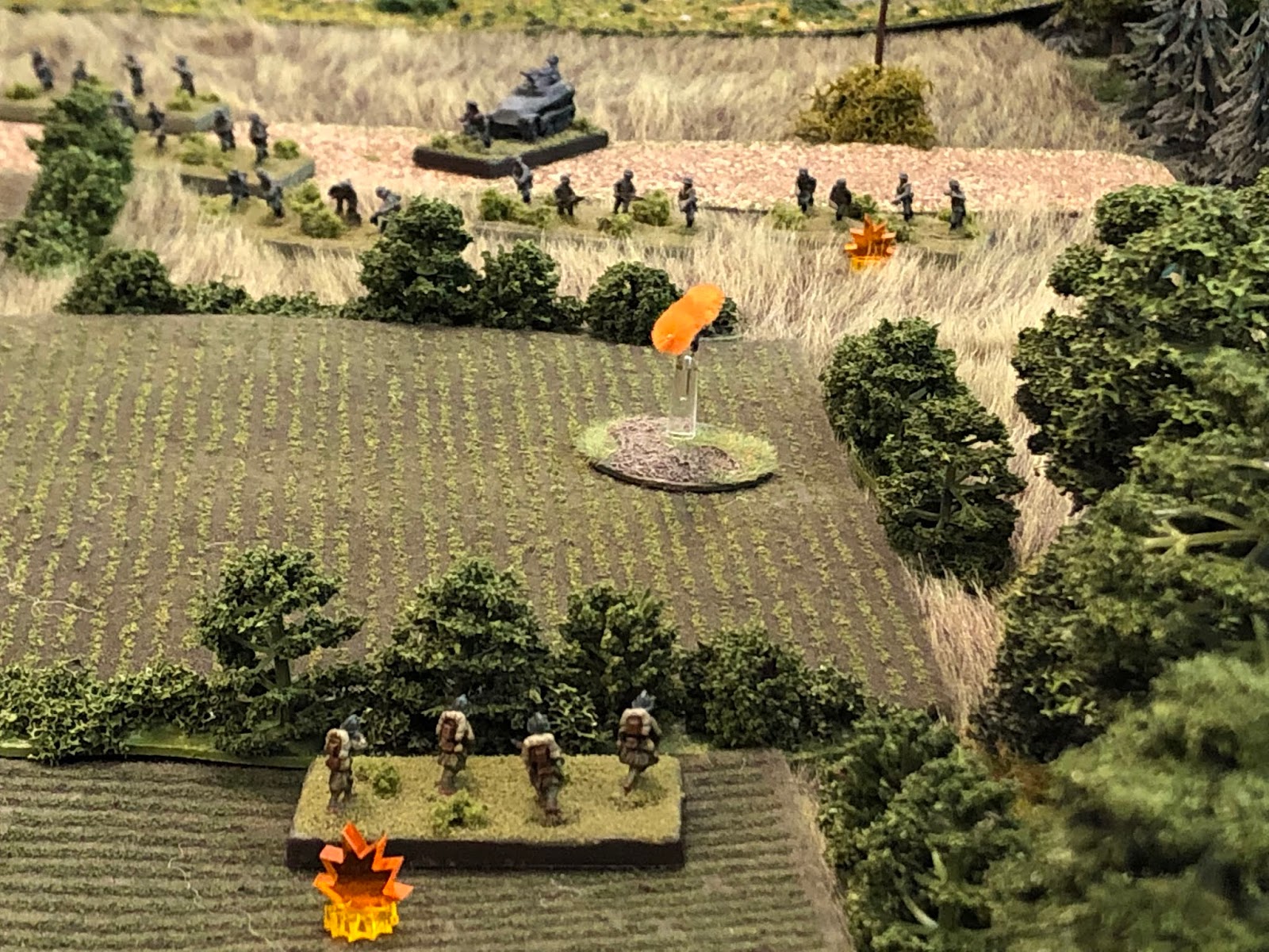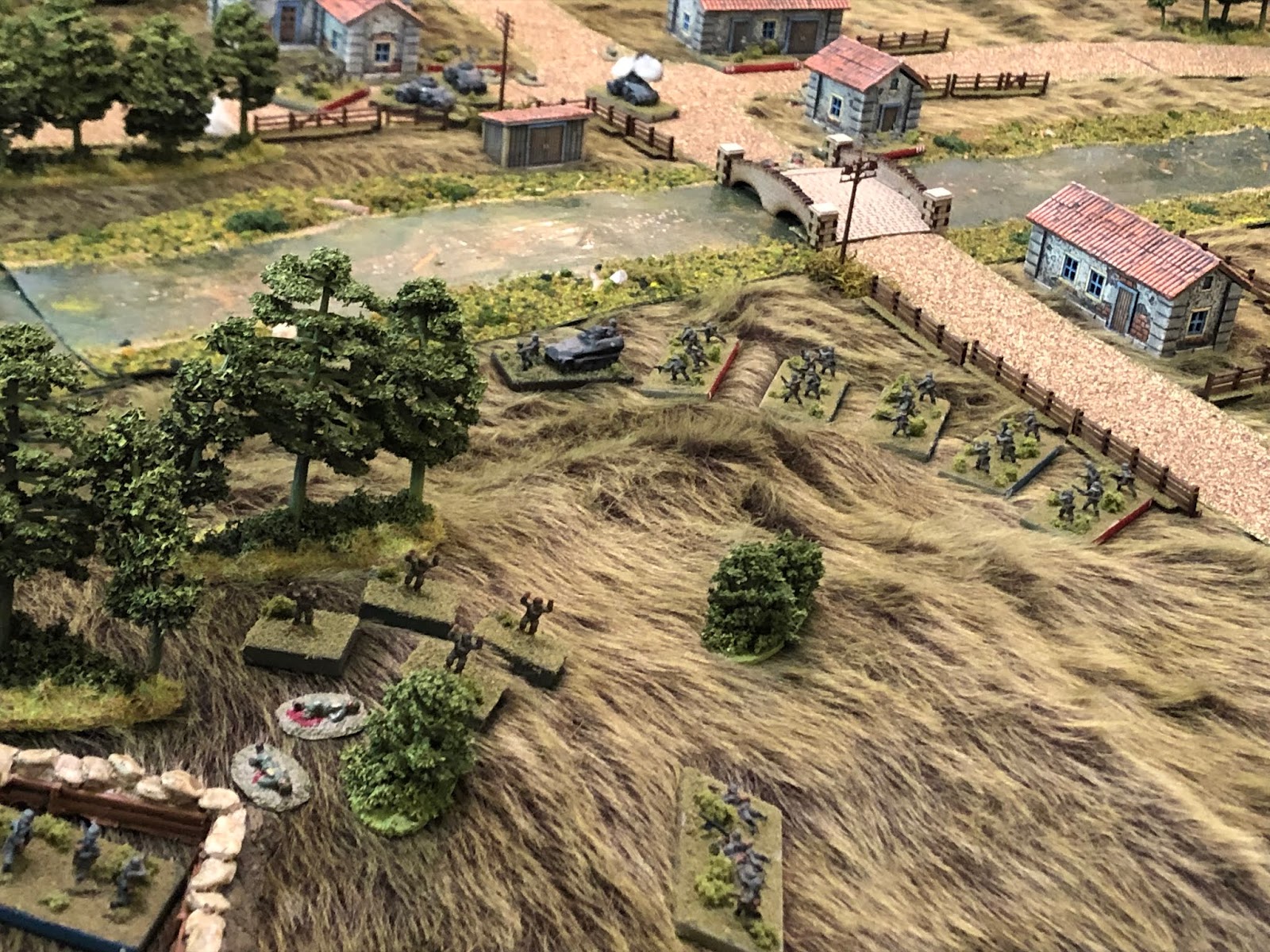 The German tanks push forward, nearing the edge of town, but having to slow down as their infantry support (top left), held up by machine gun fire from the town and mortar fire from Hill 44 (bottom right), has barely gotten off its start line.