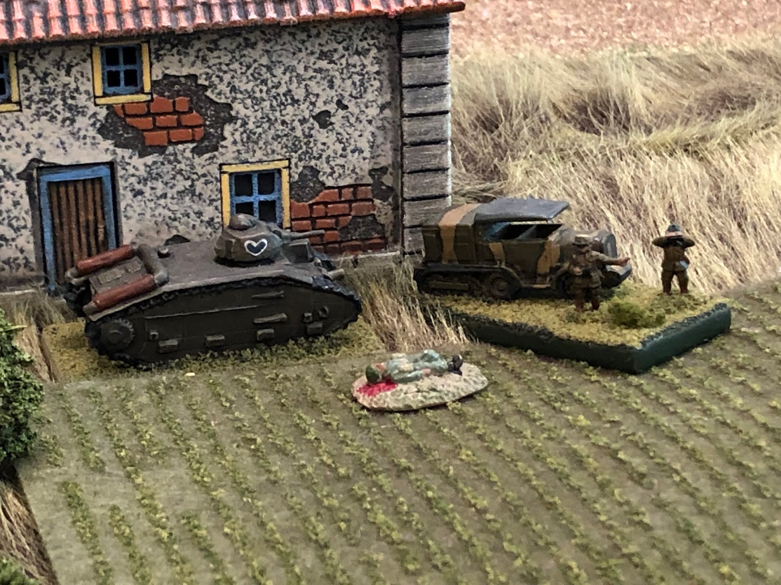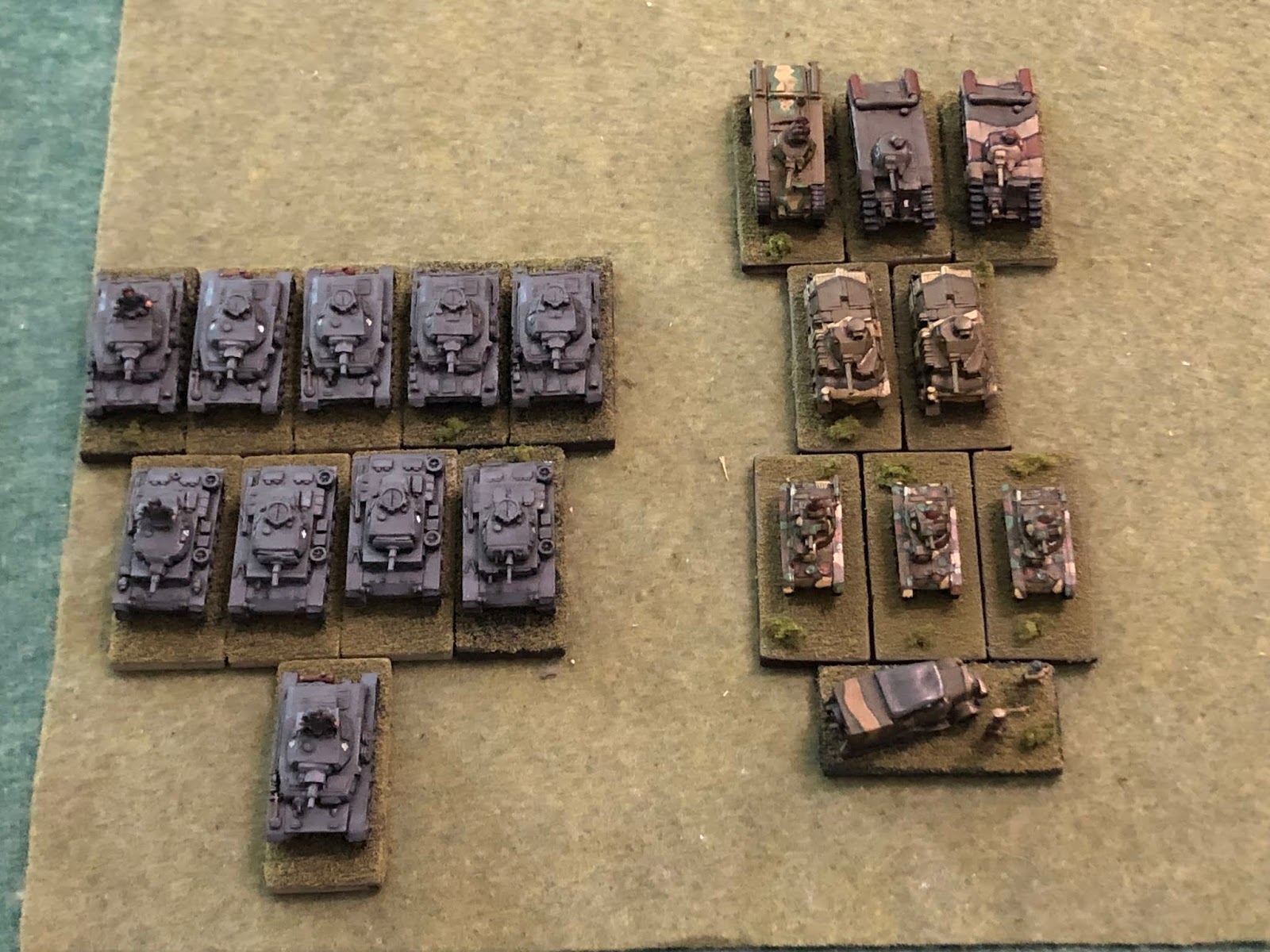 The moment you've all been waiting for, steel on steel. The French are a mix of Minifigs UK and Pendraken vehicles, while the German tanks are all Pendraken.