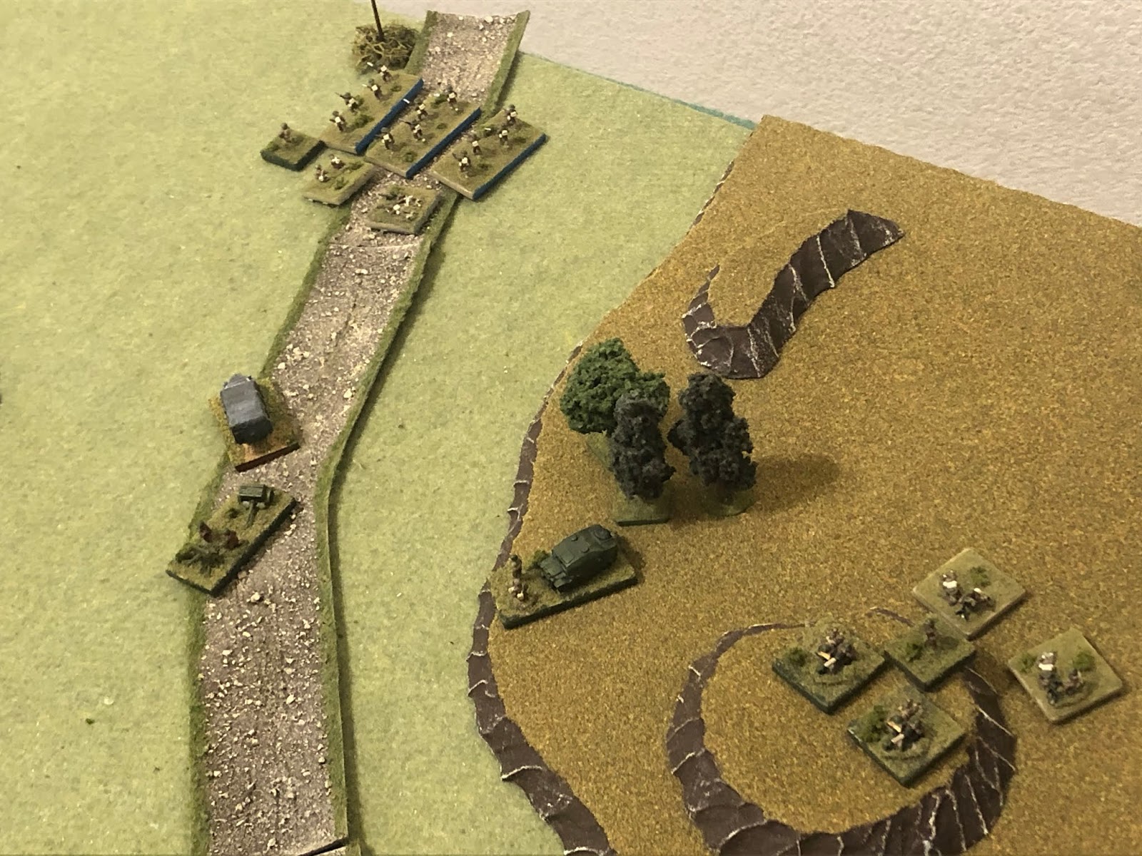 Here we are, continuing Kampfgruppe Klink's campaign in Greece.  The first battle saw Captain Freitag's 1st Schutzen Battlegroup take a key mountain crossroads manned by members of the British Royal Engineers supported by Armored Cavalry from New Zealand.  The fight saw the Germans infantry nearly eliminate the Commonwealth battlegroup, which fell back in disarray.  Captain Freitag pressed his advantage, immediately pursuing south down, where it ran into defensive positions manned by the remnants of the New Zealand 21st Infantry Battalion.  1st Schutzen then evicted the NZ 21st Inf Bn from its positions, forcing them to fall back.  The third fight saw 1st Lt Ginter's 2nd Schutzen moving secure a crossing over the D3 bridge, forcing the 27th MG Battalion back.  The fourth fight saw Major Bohm's 2nd Recce Battlegroup push back the Australian 2nd Battalion, 8th Infantry Regiment after some fierce fighting.  The fifth battle saw Captain Freitag's beleaguered 1st Schutzen Battlegroup defend the B3 bridgehead against attacks by the British Rangers/9th King's Royal Rifle Corps, and the Royal Engineers/New Zealand Cavalry, pushing the former back and destroying the latter!  The sixth battle saw Battlegroup Wehner (1st Recce) attack and destroy the Lee Force/Australian 2nd Battalion, 7th Infantry Regiment, though they suffered so many casualties they were in then combined with the 2nd Recce battlegroup.  The seventh fight saw Lt Loeb's Panzers absolutely shellack the Allies' 4th Hussars, seeing the final defeat of Allied armored reserves, opening the road to the campaign objective of Servia, and unhinging the Allied defensive line.  For the next fight we are back with Lt Loeb's panzers, looking to complete the destruction of the Australian 2nd Battalion, 8th Infantry Regiment as they attempt to escape the German encirclement.