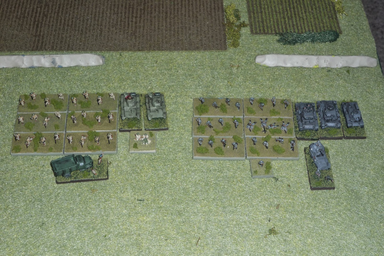 Overview, north is up, Germans on left (west) and Poles (on blinds, for now) on right (east).  The CO, 3rd Plt, and Sgt Pichler's vehicle are in the north, 2nd Plt, plus one MG, is in the south, minus one squad covering the mortar, an MG, and the field gun in the center.
