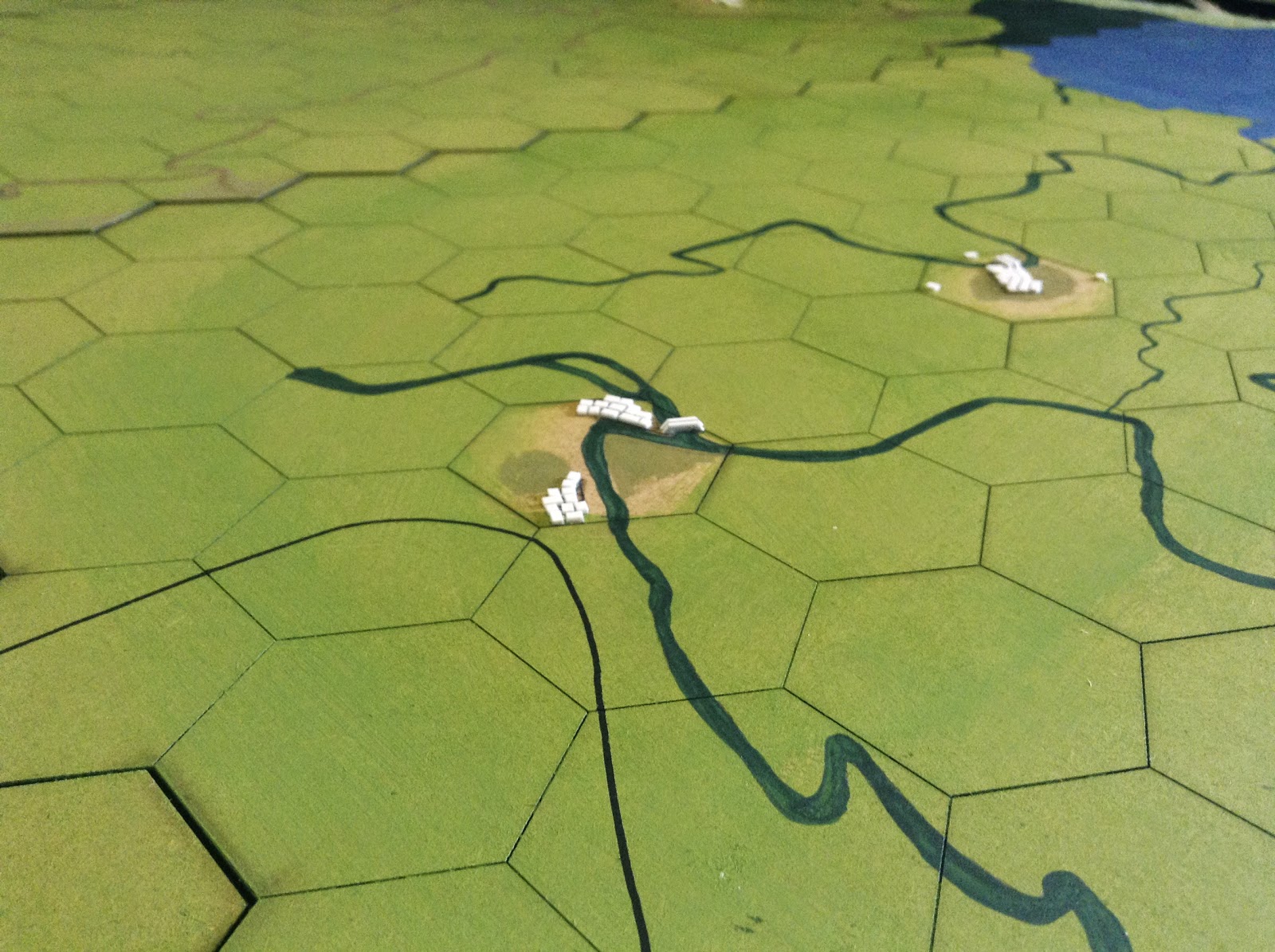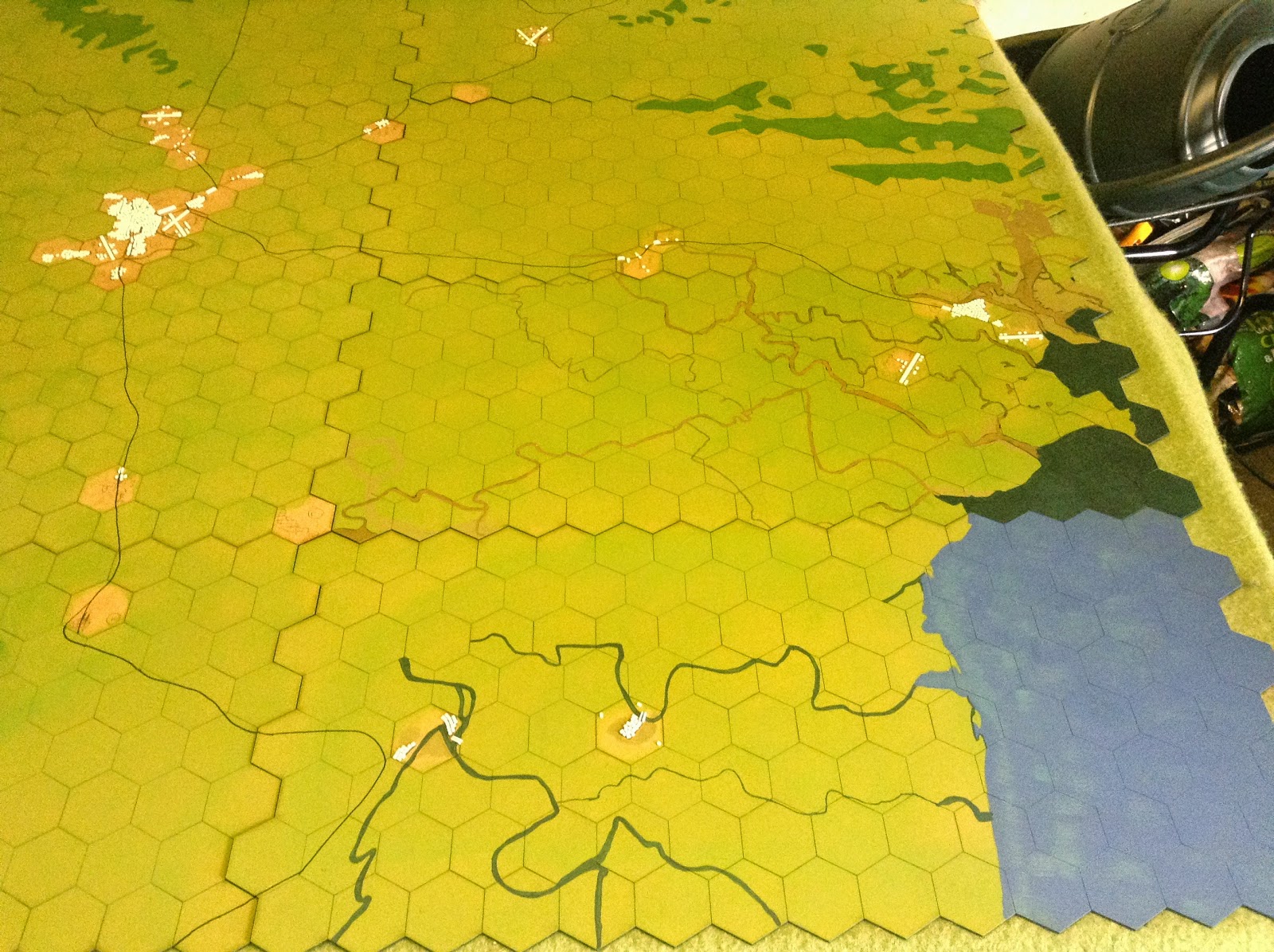 Started on the Haiphong board. The rivers need to be lightened up using gloss brown in the middle of the channels and I also need to work on the sea and beach hexes.  Built up area is all cut out and will get added tonight.