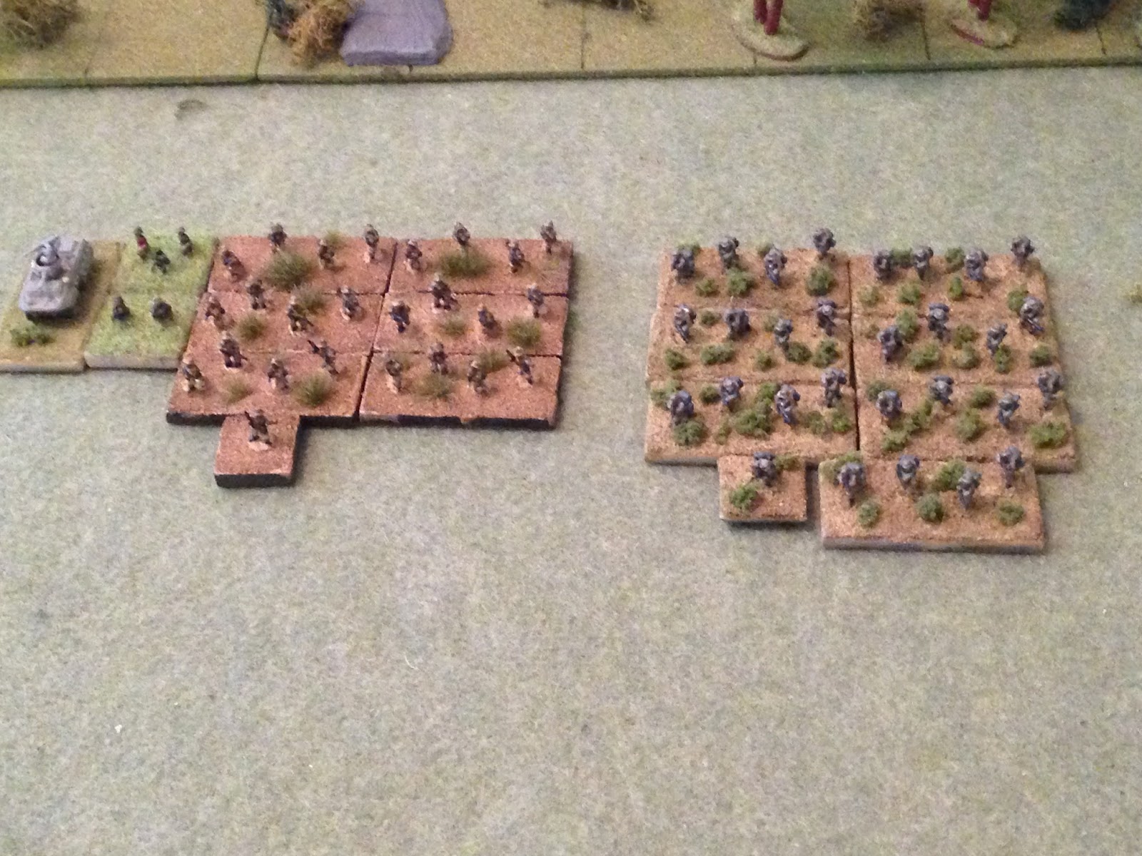 The opposing forces, with regime troops on the left and CLA on the right.  The CLA is comprised of Minifigs modern Australians ('modern' being relative, they look to be Vietnam era), while the regime force is made up of Australians from Pendraken's Vietnam Range, heavy weapons are NVA/VC/Vietminh from Pendraken's Vietnam/Indochina Ranges, and an M8 armored car from Pendraken's WWII Americans Range.