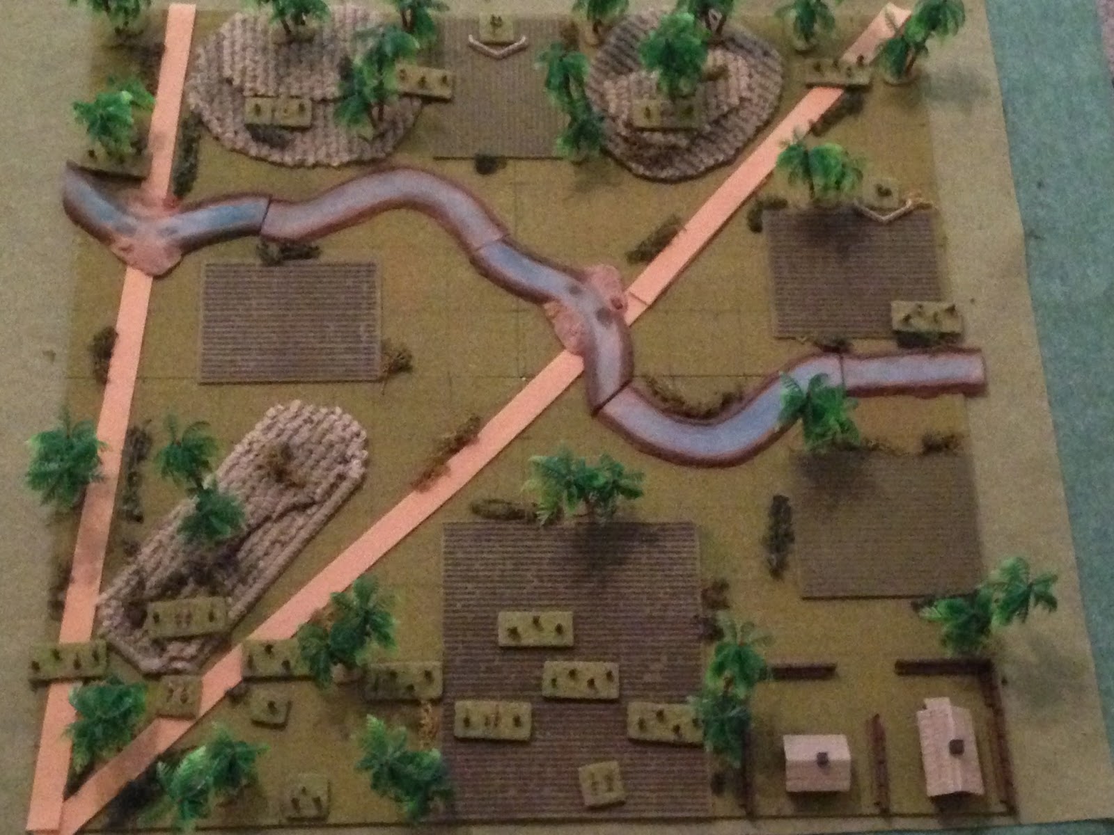 Overview, north is up, the cliffs are just off table at top.  The regime troops are dug in at the top, on the north side of the river, which can be crossed only at the two fords (far left and center).  The CLA force is at bottom, fanned  out and moving forward to contact, though they don't know exactly where the enemy line is.