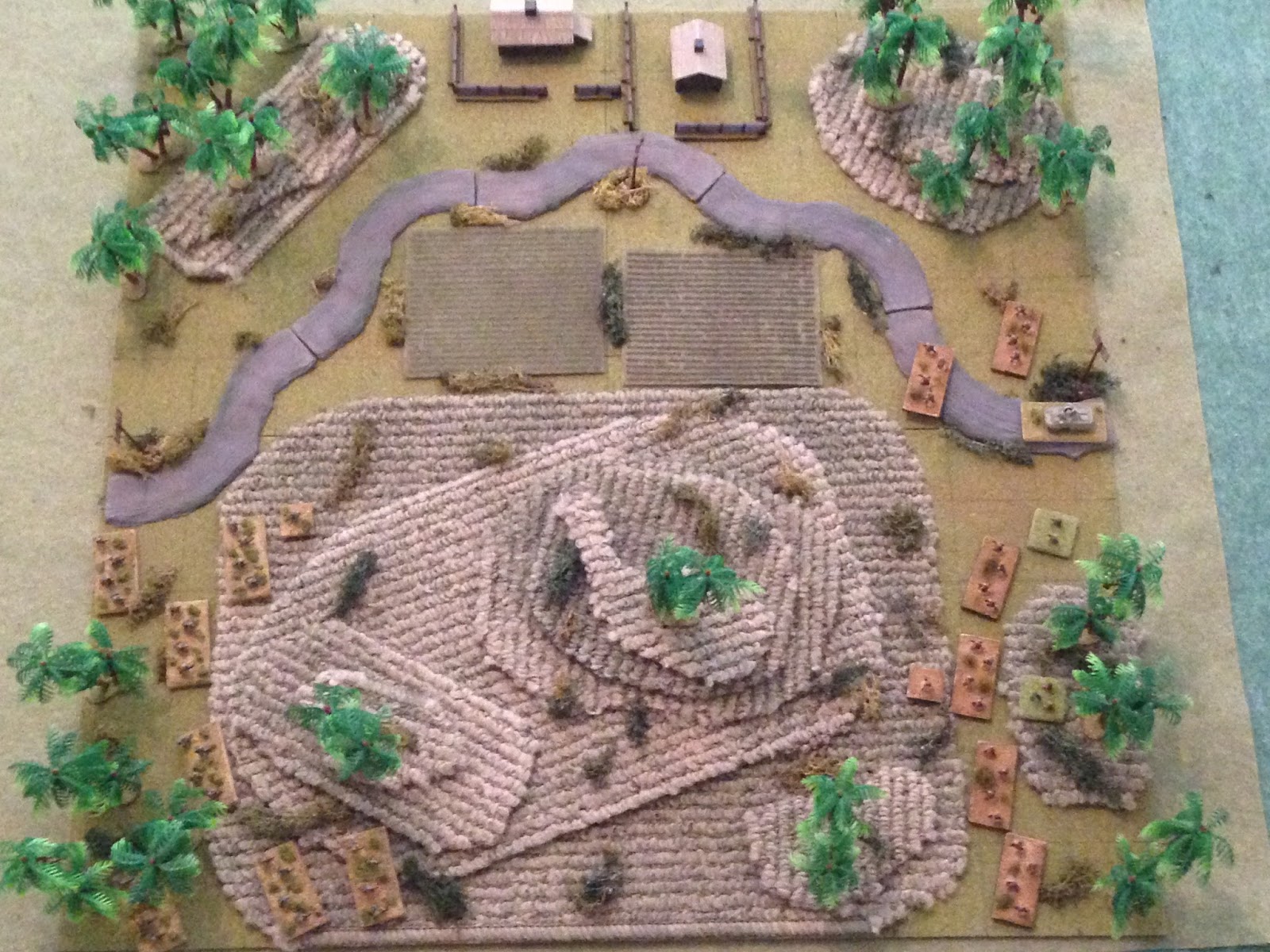Overview, north is up.  The Castro-force is expecting trouble, so is dismounted and fanned out along the right (east) side of the board.  The CLA force is hiding on the back side of Hill 67, on the left (west) side of the board.  The purpose of this is to avoid observation by enemy elements that could call in air/arty, sort of a micro-reverse slope defense.  But they're ready to spring their ambush, so, at the micro-level they shan't be sitting tight, waiting for the enemy to crest.
