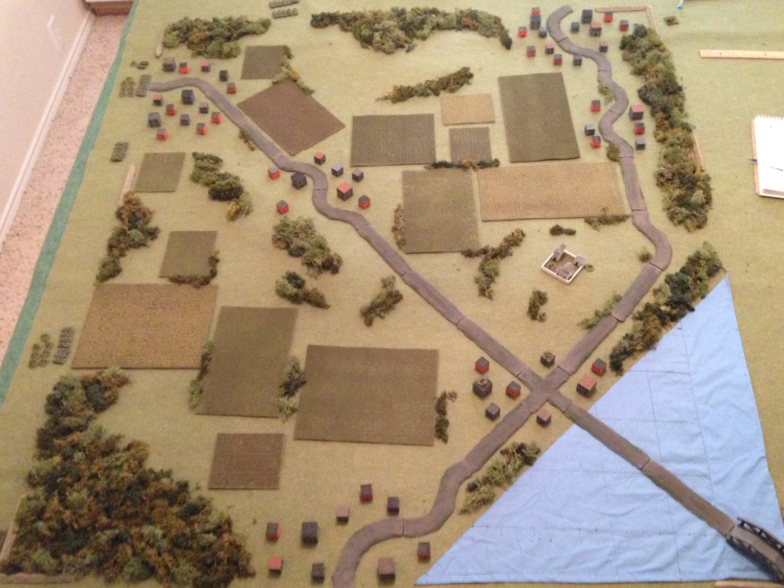 The map, looking west to east (north is left), with the Soviets entering from left and top left, and the NATO forces trying to withdraw via the bridge at bottom right.  The Bundeswehr bridge force is at center right near the crossroads, while Col Lacy, Lt Ensmith's Mech Plt, and Lt Travers' tanks are entering the table via the road at top right, while Capt Phillips leads Capt Sighe's Mech Plt and the Wpns Co attachments entering the table via the road at bottom center.