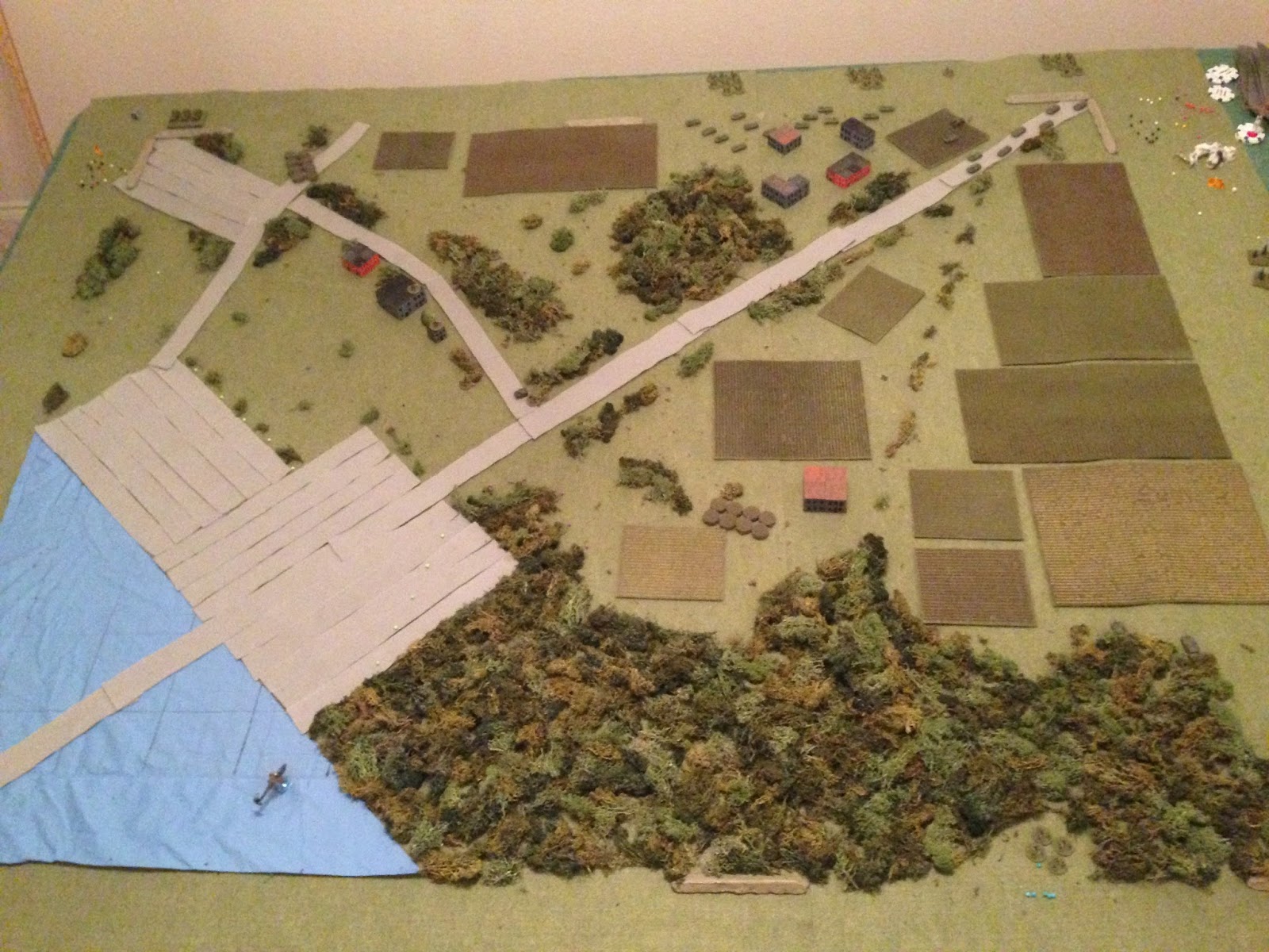 Overview of table, north is up.  The US force is occupying a line roughly from the top left corner to the bottom right corner.  The Soviets are entering the table at top right, needing to exit off the board at bottom left.  Tanks must use the bridge, but BMPs may swim.  All of that gray  mess is supposed to represent a paved slipway leading down to the river.