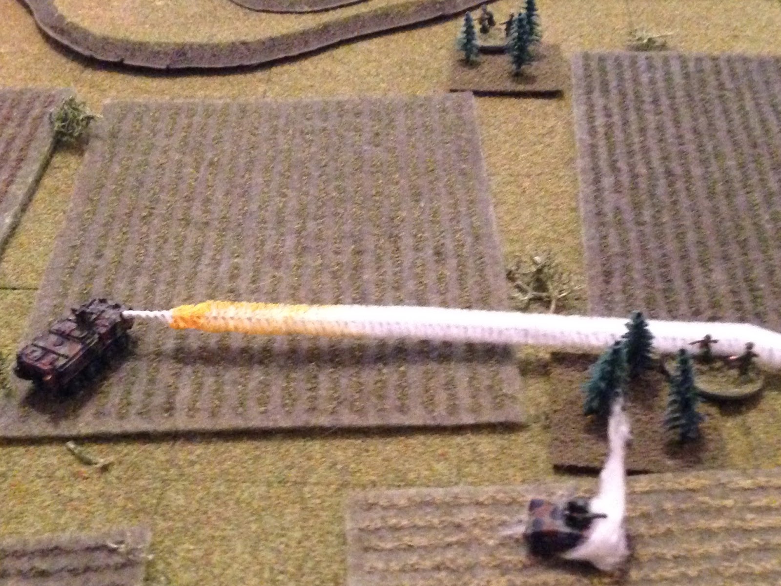 The Cuban HMMWV (bottom right) dodged an RPG (bottom left), moved up, and launched a TOW at an enemy T-62.  To see how the fight turned out, please check the blog at: