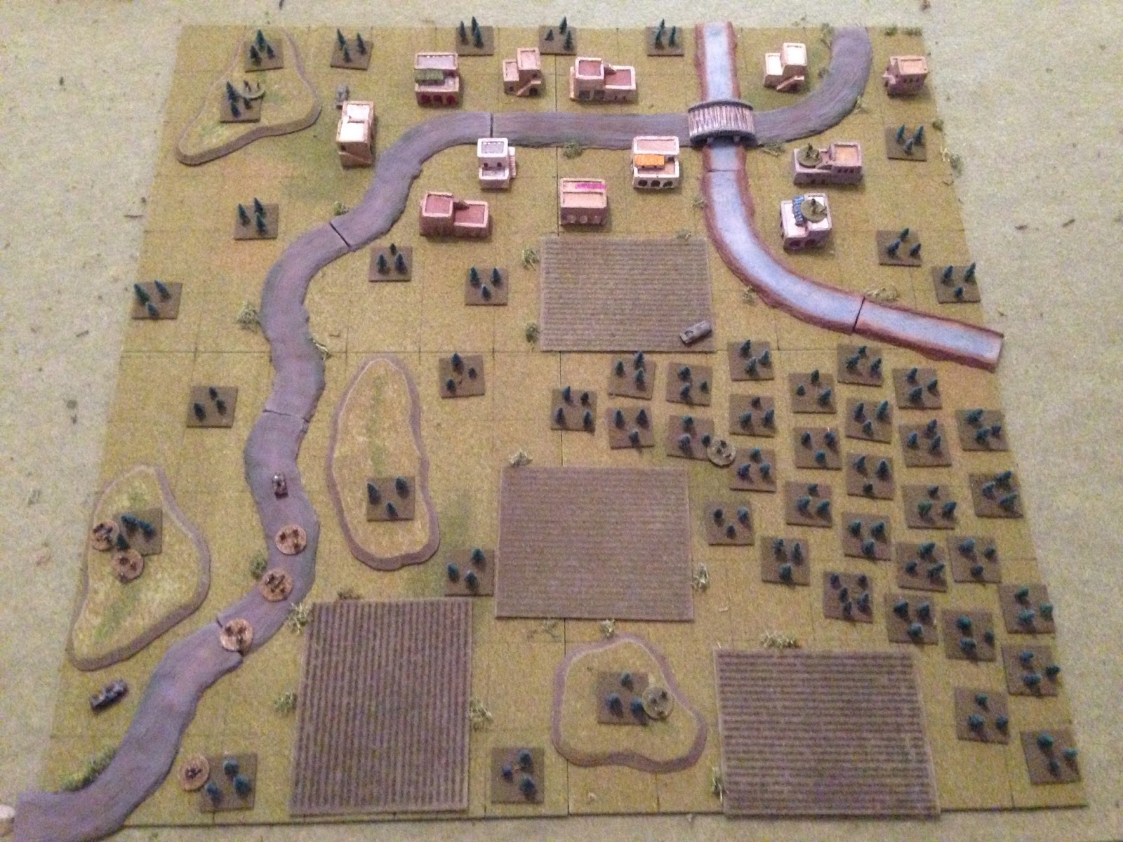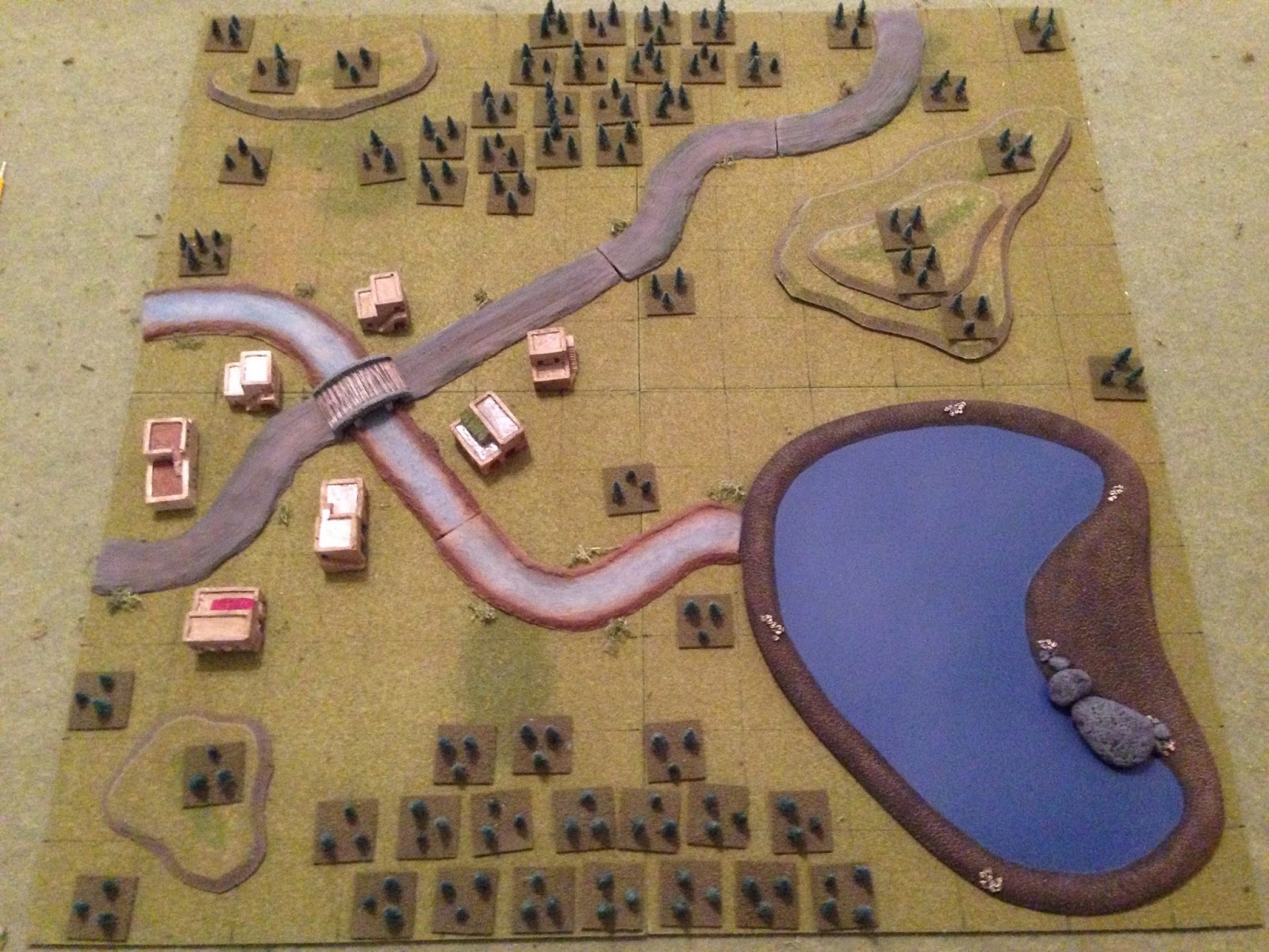 Overiew of map, north is up.  Abrvo is at left, Lake Lagoda at bottom right, and Hill 142 at top right.  Yes, I need to put some flock on the lake...