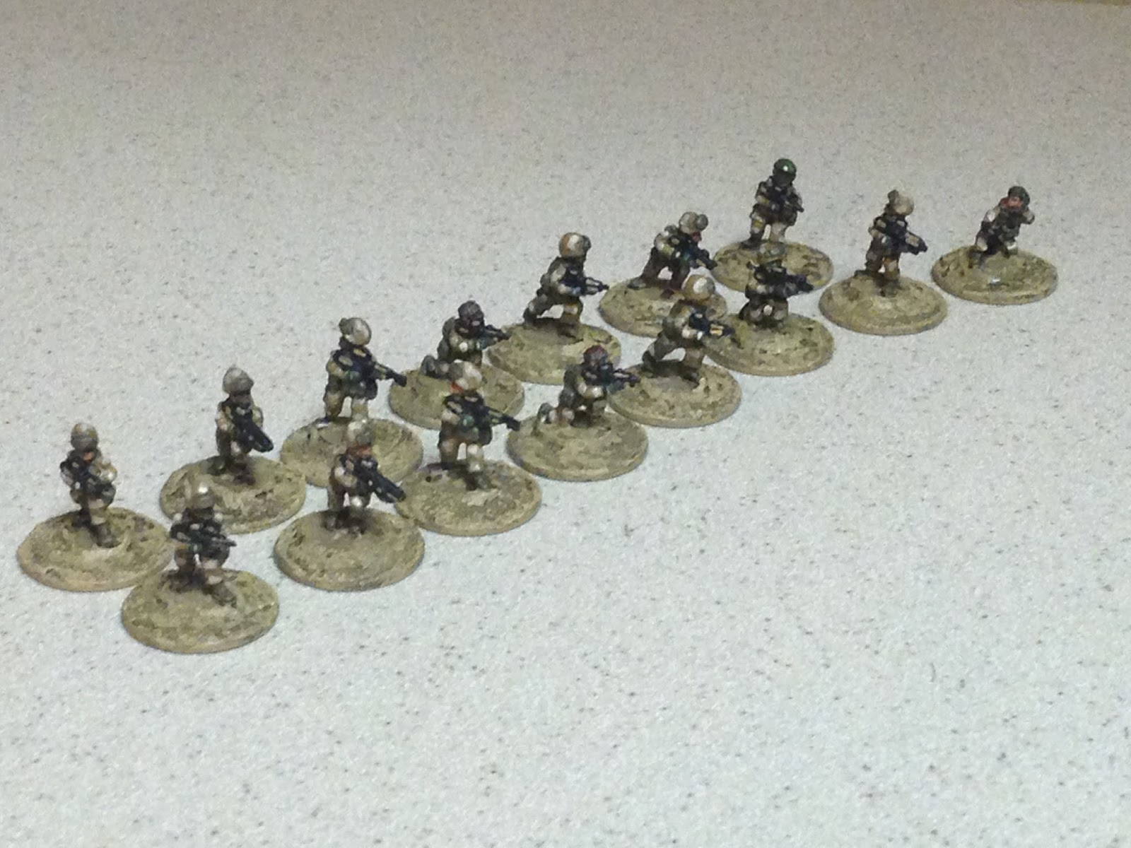 The whole pack of 15 Royal Marines.  A mix of weapons, with an assortment of helmets, berets, and even a couple bare-heads.  Pretty humble basing, just stuck them to pennies, threw some sand on them, painted it, and gave it a wash.  Not too bad I hope.  I may buy another pack at some point, just to have a 30-man platoon, but this will do for now.  They'll probably see the tabletop pretty soon in South Leon ;)   If you're not familiar with South Leon, you need to head over to: http://cubalibrewargame.blogspot.com/2015/12/south-leon-on-slow-ride-down-aka.html
