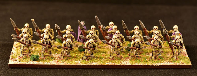 I liked the idea of my skeletal warriors looking like a horde so I order more spearmen to add to each base.  There ended up being 25 on each base plus a vampire/necromancer to keep them all in order.  You know those skellies won't keep nice ranks and files on their own.