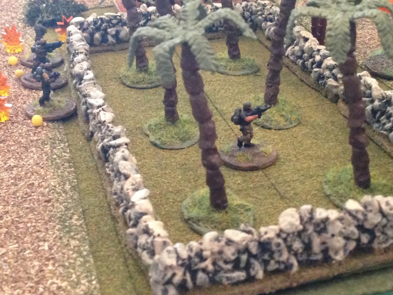 With the team pinned down under heavy fire (top left), Trinity says hell with it.  He hops the stone wall and charges through the rubber tree plantation, intent on coming to grips with the terrorists in The Thicket.  To see how the fight turned out, please check the blog at: