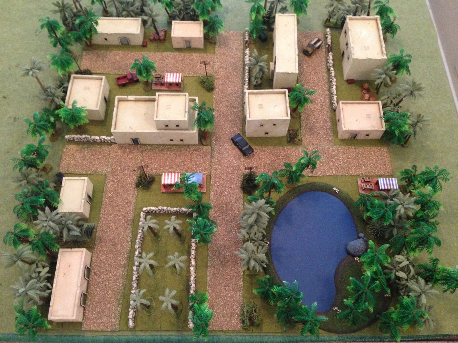 Overview of The Adjutant's compound, north is up and the table is 2' x 2'.  The target building is at top right, the Cubans will enter at bottom left.  Numerous dirt roads criss-cross the area; there's a mini-plantation of rubber trees at bottom center left, and a park with a pond at bottom center right.