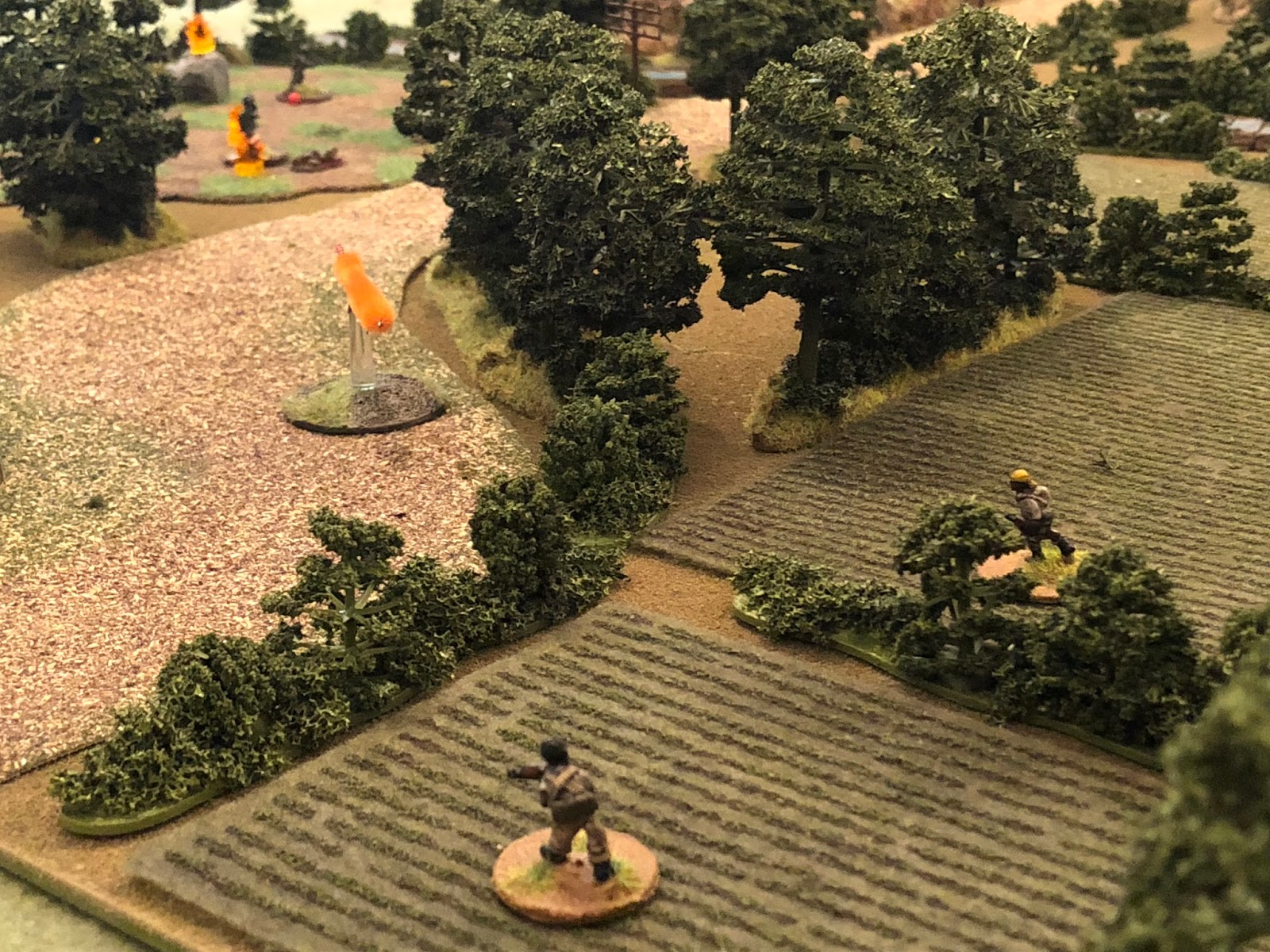 TF Hawk continues towards its blocking positions when the point man calls a halt; they'd come to their next objective, so the troops posted 360 degree security while the leaders huddled up.  Just south of the road was a farm that needs to be cleared, but you can't clear the farm without first clearing the high ground to northeast of the farm.  Lt Espinale's group would hold place in support while Lt Candelario led his group to the north to clear the high ground (this fight).  Once the high ground is secured, Lt Gonzalez' group will take the farm from the south (next fight).