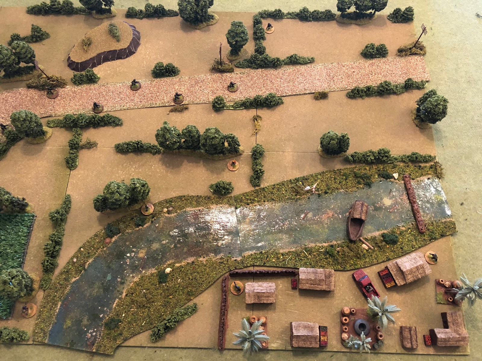 Overview, north is up, with Cubans entering the table in the west (left).  There's a crop field in the southwest, the northern edge of a local village at bottom center right, a dirt road running east-west, a small knoll at top center left, and a river that's only a few feet deep at bottom center running to right.  Other than that there are only stands of trees and bushes breaking up the landscape.