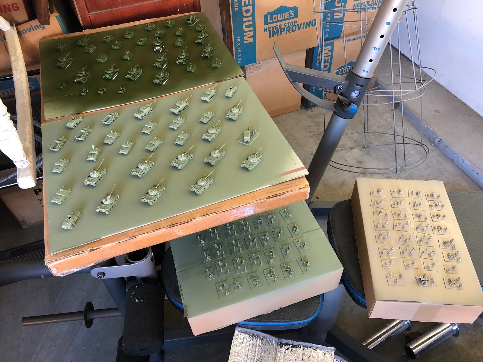 Top left is US vehicles, center is Soviet vehicles, bottom center is US infantry, and bottom right is Soviet infantry.  Gotta love Walmart Krylon spray cans.  And forgive me, all that sunlight has washed out the colors a bit!  In any case, I've made the executive decision to, as I quite often do, throw together some cool paintjobs that aren't historically accurate.  To see more pics, please check the blog at: