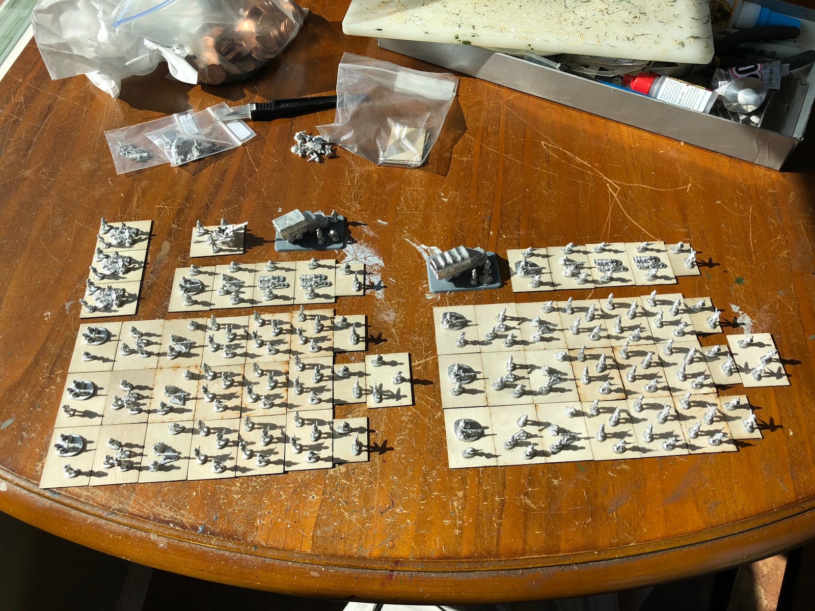 Tonight I got all the infantry from my Pendraken Cold War project cleaned up and prepped for priming, here are some pics, but they're not totally ready.  I'll explain below...  In any case, I really need some warm weather so I can get everything spray primed.  I apologize, it's tough to see detail in the photos since these are bare metal, but I wanted to share.
