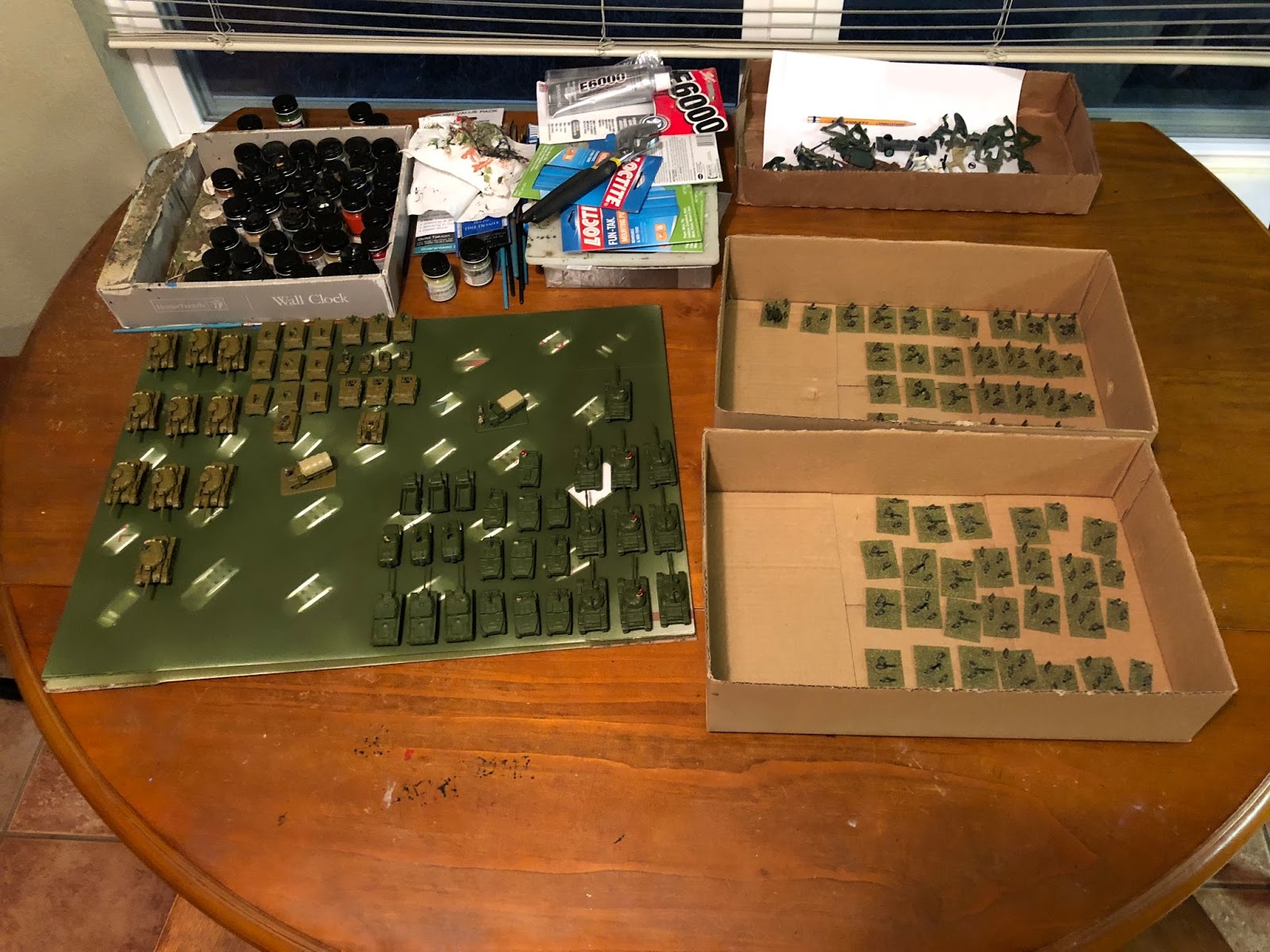 No blog update this evening, but I'm making progress on the infantry.  US troops are painted, Soviets almost, then have to wash and flock both.