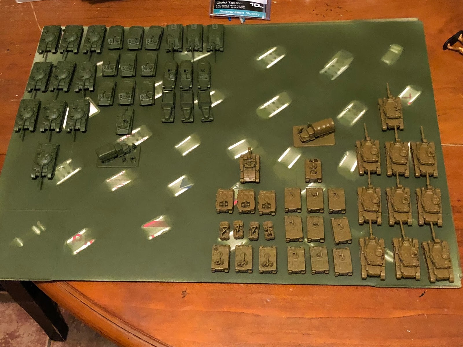 The whole mess, Soviets at top left, Yanks at bottom right, each side consisting of a tank company, a mechanized company, a recon platoon, a mortar platoon, a tank destroyer platoon, an AA gun, and a Battalion commander.  To see more pics, please check the blog at: