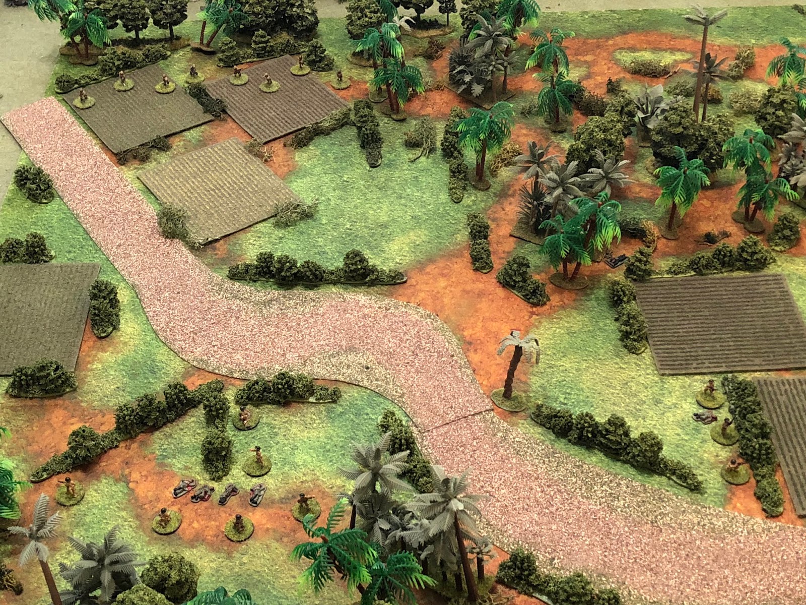 The last fight for my US Marine platoon in the Dutch East Indies is posted. Harassed and harried by the Japanese, they've eliminated a blocking position, opening their route of escape, but pursuing Japanese units have caught up to them.  The Marines fight a desperate delaying action to allow for the evacuation of the wounded.