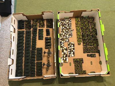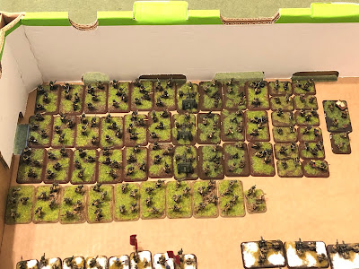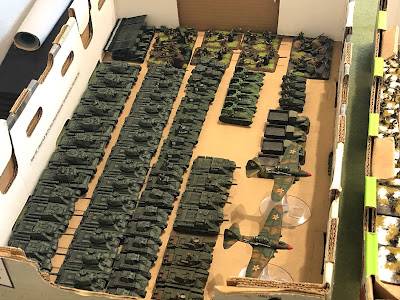 Here's my Soviet infantry, basically a three-battalion regiment (the top three rows), plus a Sub-Machine Gun (SMG) battalion (fourth row down, the ones that are based in a lighter brown).  Almost all of these were painted by someone else.
