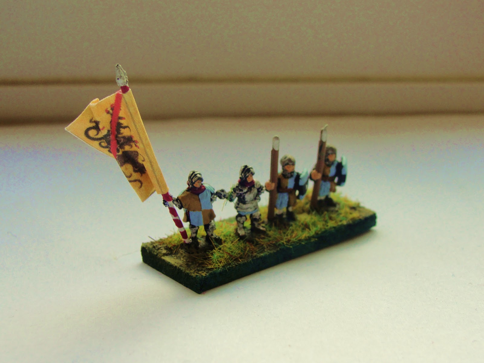 Painting layered Vallejo Acrylics off black undercoat. Flag hand painted on cloth. Base 40x30x3mm MDF.