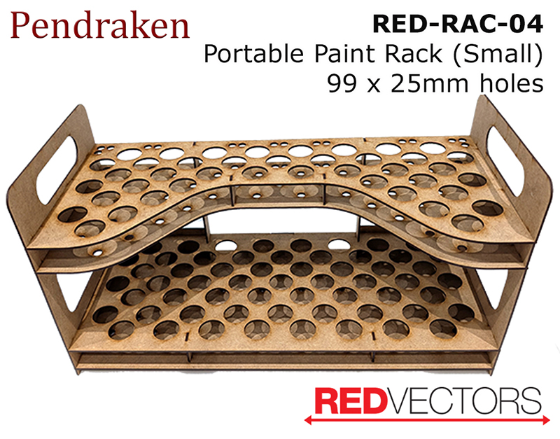 We've got a couple of quick additions for you next, with a pair of portable paint racks now available. The 'Small' can take 99 pots of any 25mm-width paints, so Vallejo, Army Painter, etc.  The 'Large' has 64 holes for the larger 35mm-width pots like Citadel.