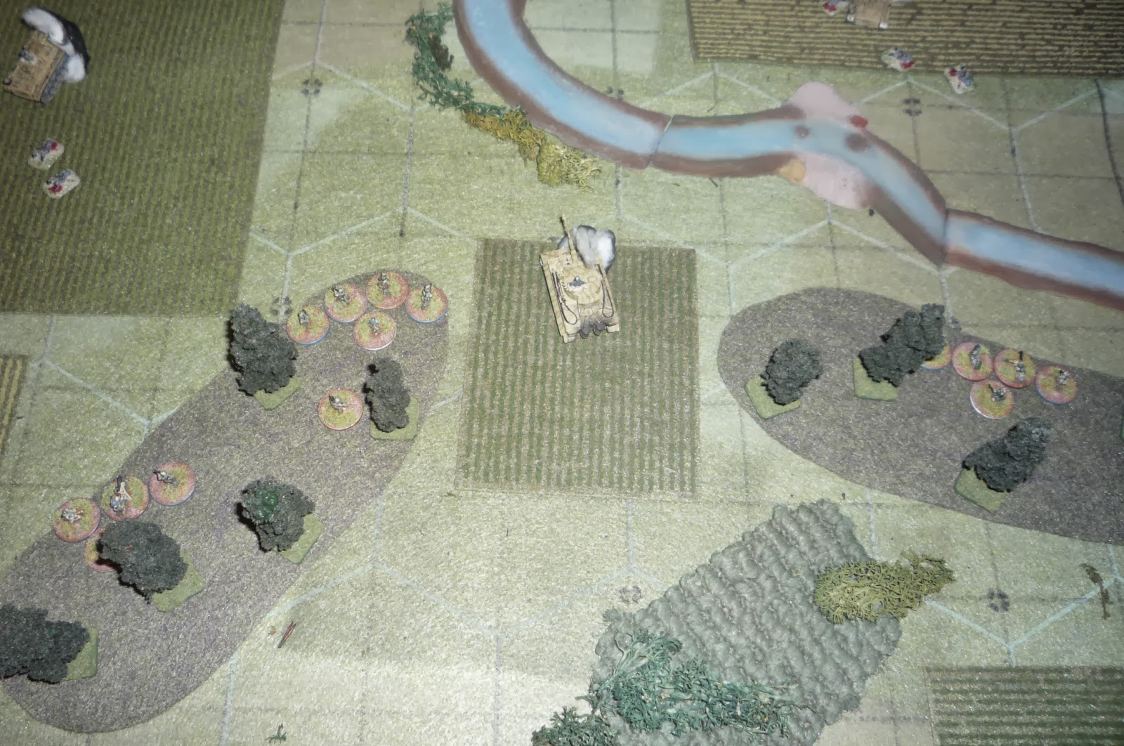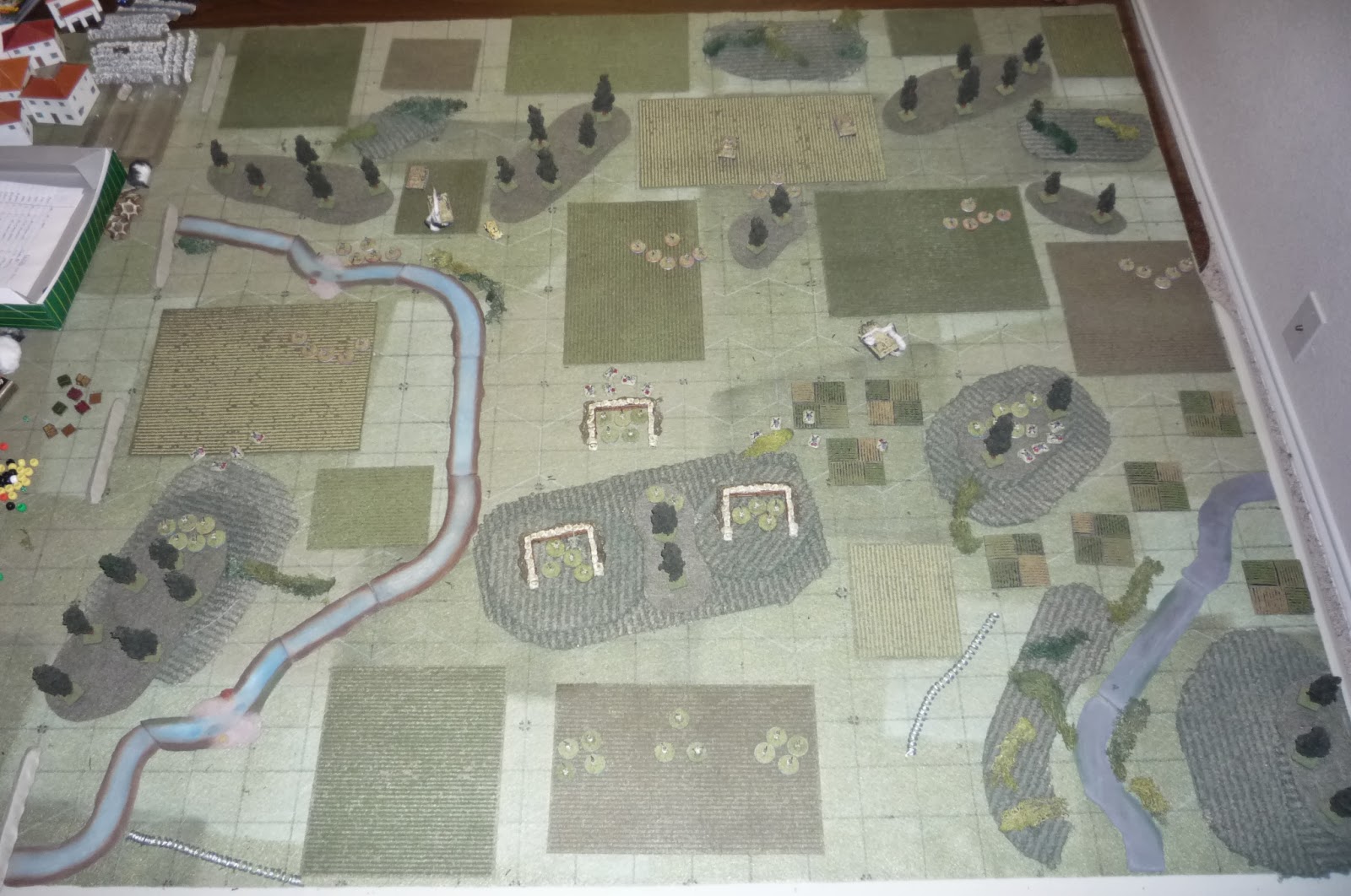 The German left has (from left to right) 3AG, 3FG, and 2FG (which has an MG-42 on a tripod instead of a bipod LMG), and 2AG (far right, barely in the picture opposite US 3A in the forward emplacement).  A German Pz Mk III (P3) is also on this side.  German center, showing (again) 2FG and 2AG in center, with P2 at bottom left, a Sdkfz 222 armored car at center right, and P1 at far right.  The German right, with 1AT in field at top, 1FG at ford, and P1 at center bottom.