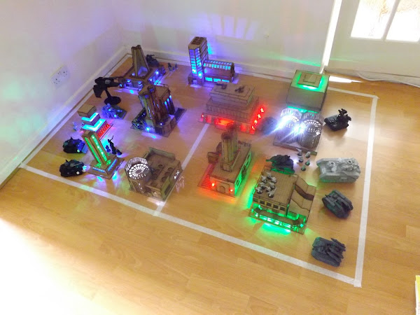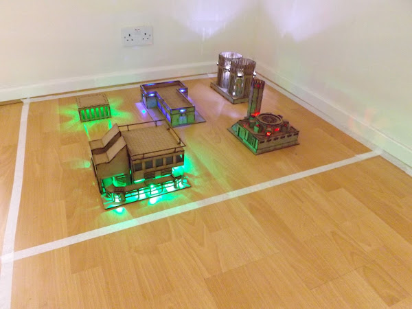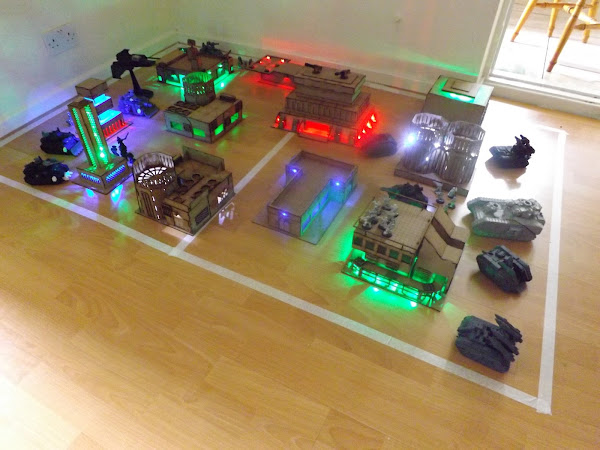 Now I have filled the board up with more buildings, I have added the Sector base, Tech post, and both versions of the Power station. This setup has reduced a lot of the long line of sight but left a couple. There is still plenty of room to move large models around.