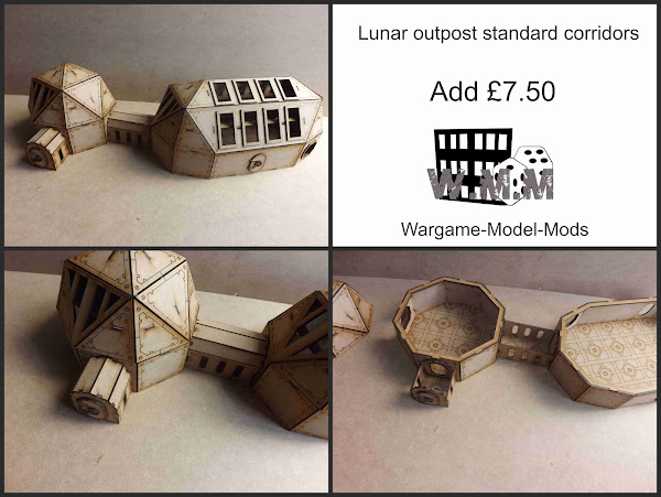 Final add-on. A set of wide corridors for the lunar out post buildings, three in a set a small airlock and a 75mm corridor and 150mm corridor. They can fit straight up against your buildings or have an airlock bulkhead on the side facing out.