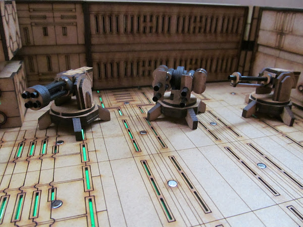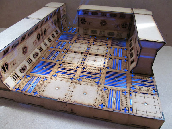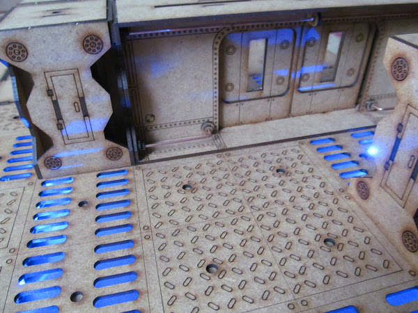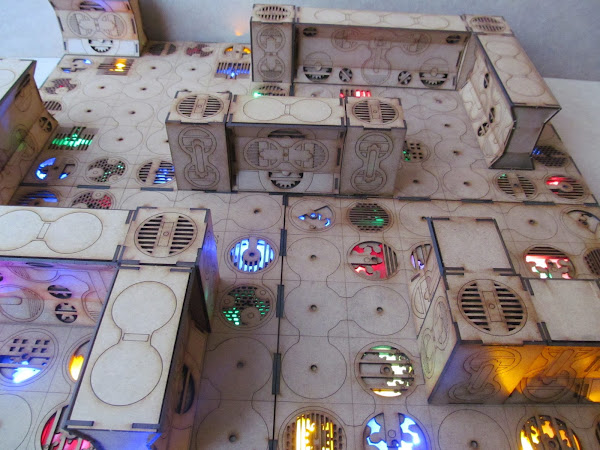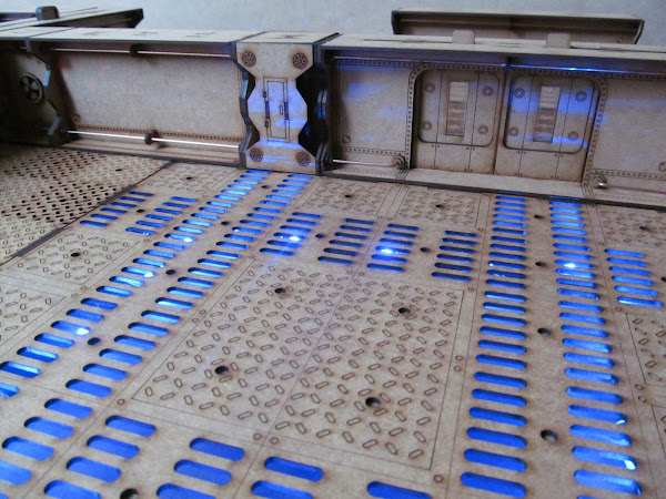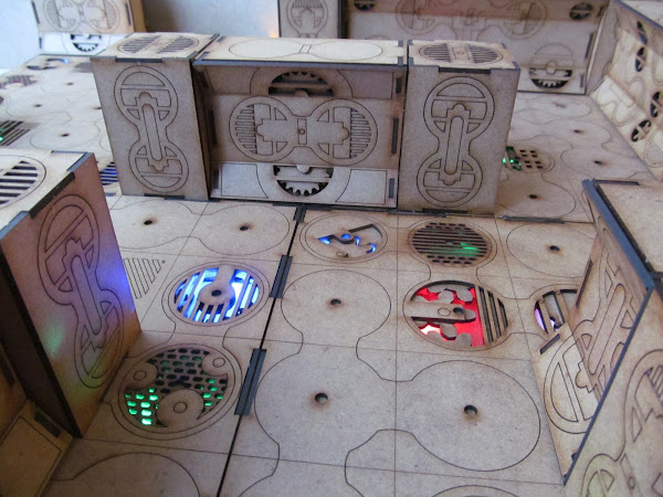 Wargaming tiles with integrated lighting. For use as game boards or with corridors as dungeon style gaming tables for 28mm games