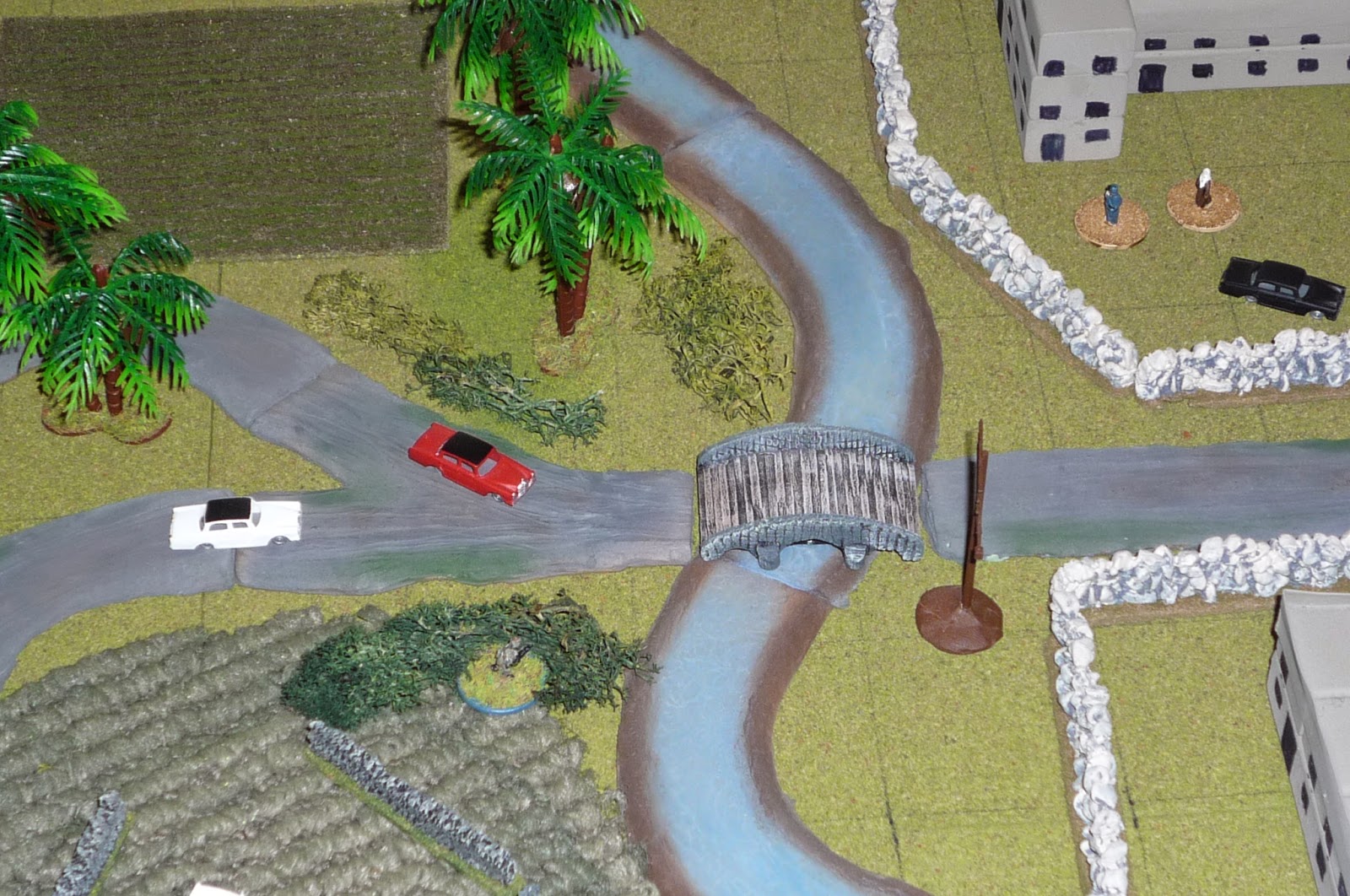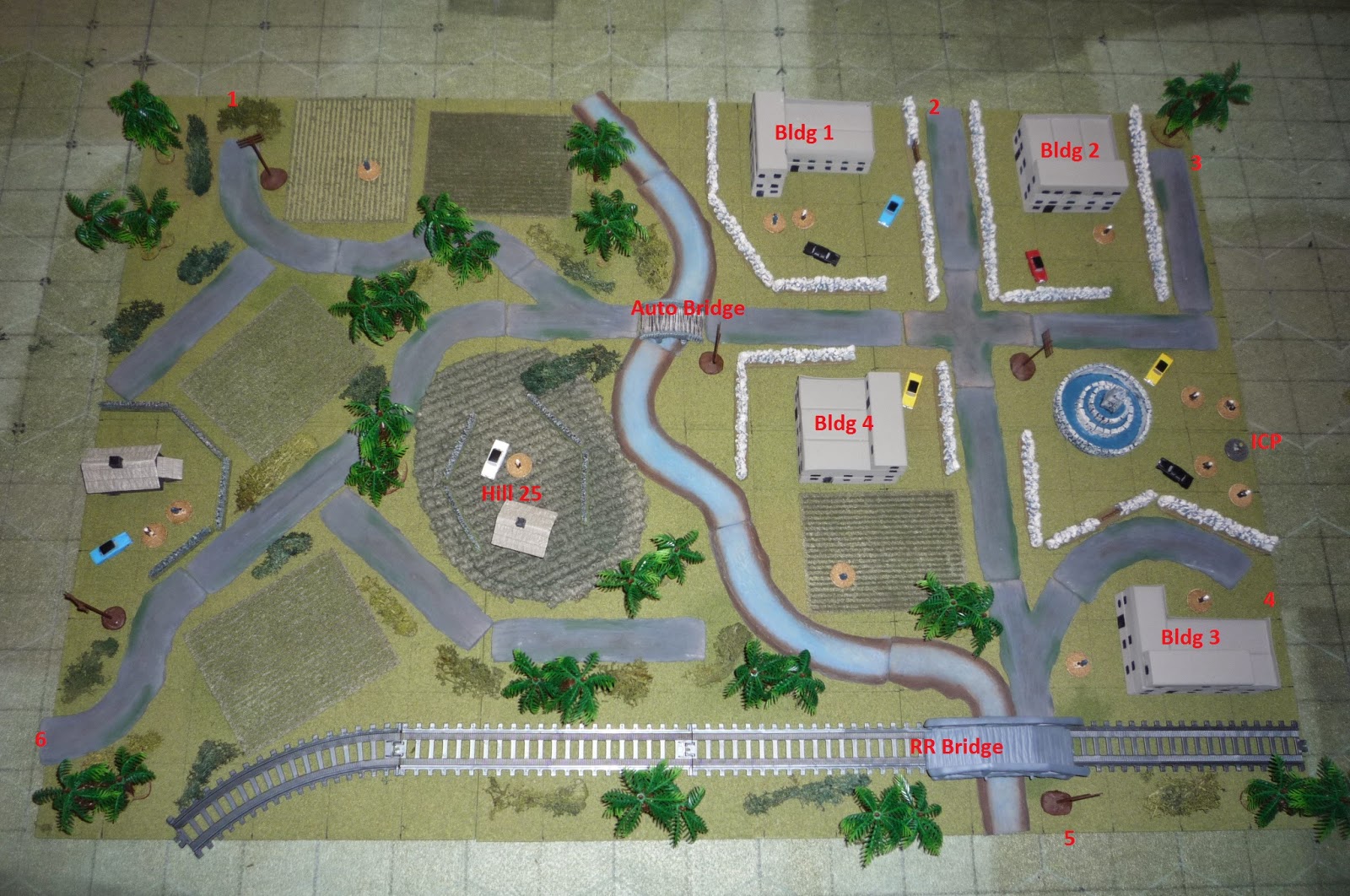 Overview of the board (3' x 2'), with bad guy 'hotspots' (1-6), buildings, bridges, Hill 25, and Initial Contact Point (ICP) labelled.  North is up.